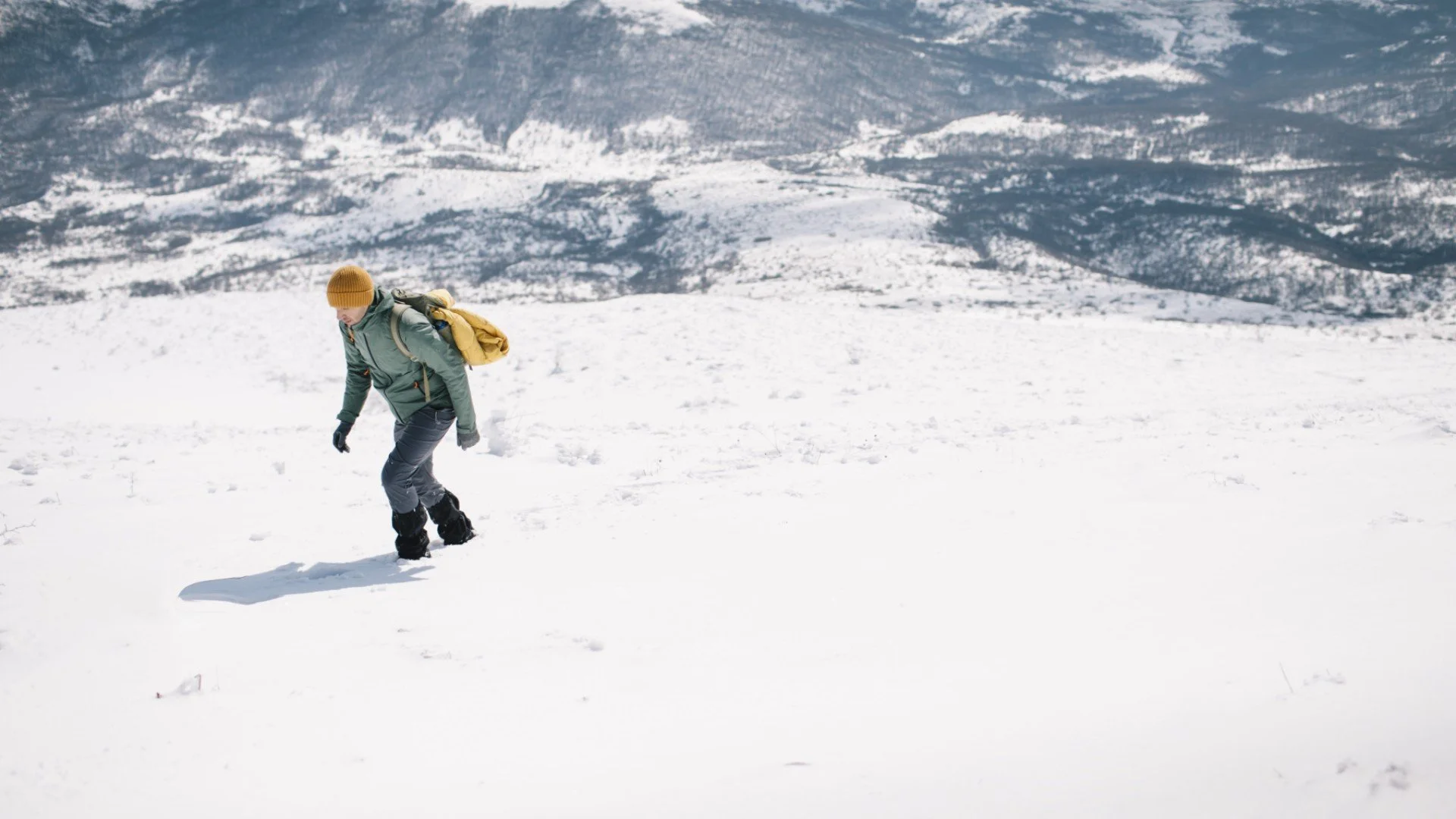 Image 3: A person wearing a well-made jacket braves the cold during an adventure in a winter wonderland